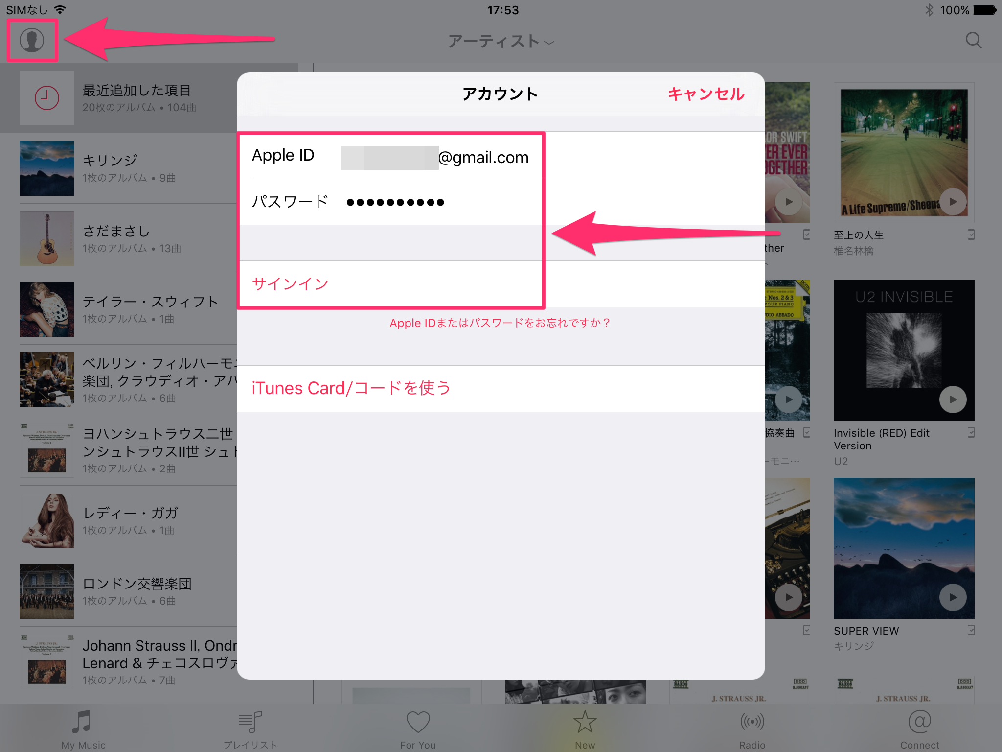 iTunes右上の人形アイコンをクリックして、Androidスマホと同じアカウント(Apple ID)を入力してサインインします。